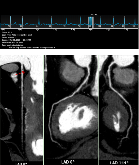 在张大爷的检查中,医生利用宽体探测器CT获得了高质量的冠状动脉图像。图像清晰显示了狭窄的位置和程度,以及心肌桥的形态。这种技术的优势在于其高时间分辨率和空间分辨率,能够“冻结”心脏运动,避免运动伪影,从而提供诊断所需的精细解剖信息。此外,低剂量扫描技术的应用,还减少了辐射暴露,特别适合老年和体弱患者。