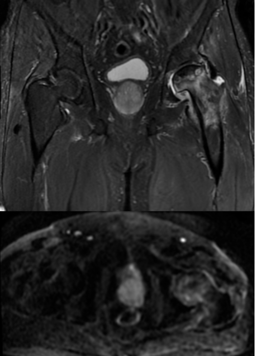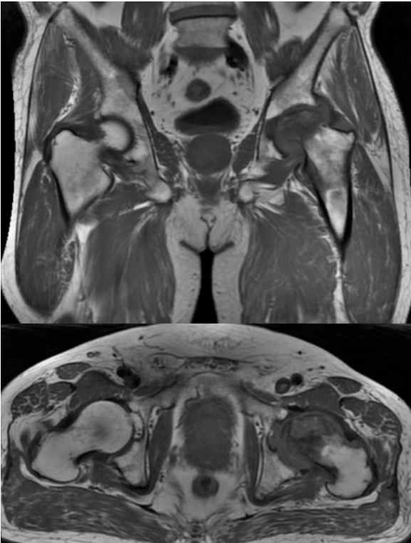 左侧股骨头变扁,局部塌陷,骨质内见线状T1WI低信号,髋臼及股骨近端骨松质见片状T1WI低、T2WI压脂高信号,DWI高信号,周围滑膜增厚,邻近软组织肿胀,PD压脂信号增高,关节腔少量积液。