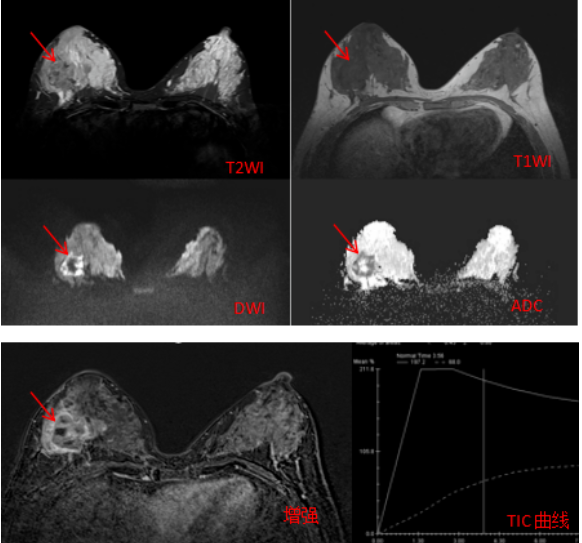 强化表现:动态增强扫描显示病变明显不均匀强化,中心见片状无强化区(可能为坏死组织),时间-信号强度曲线呈“早期快速流入-晚期流出型”,这是恶性肿瘤的常见血流动力学表现;