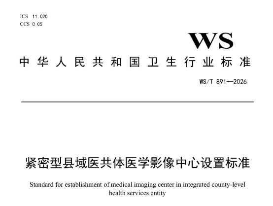 2026年3月,国家卫生健康委正式发布《紧密型县域医共体医学影像中心设置标准》,自2026年9月1日起施行。这份推荐性卫生行业标准,规定了医学影像中心设置的基本要求、场所要求、设施设备要求、人员要求、信息化要求、安全要求和管理要求,适用于紧密型县域医共体医学影像中心的规划、建设与管理。